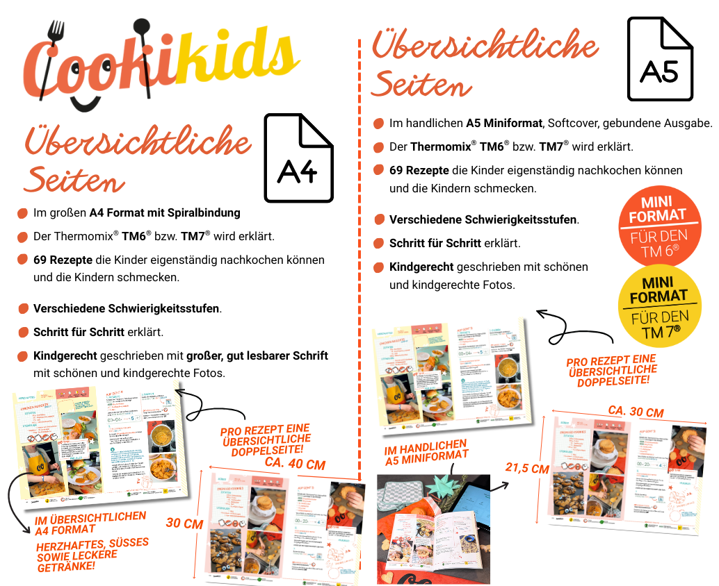 Die Cookikids-Kochbücher sind ausschließlich für den Thermomix® konzipiert. Es gibt verschiedene Buchvarianten für den TM6® (inkl. TM5) sowie für den TM7®. Die verwendeten Symbole, Bedienelemente und Erklärungen sind exakt auf das jeweilige Gerät abgestimmt und entsprechen den Funktionen des entsprechenden Thermomix®-Modells.